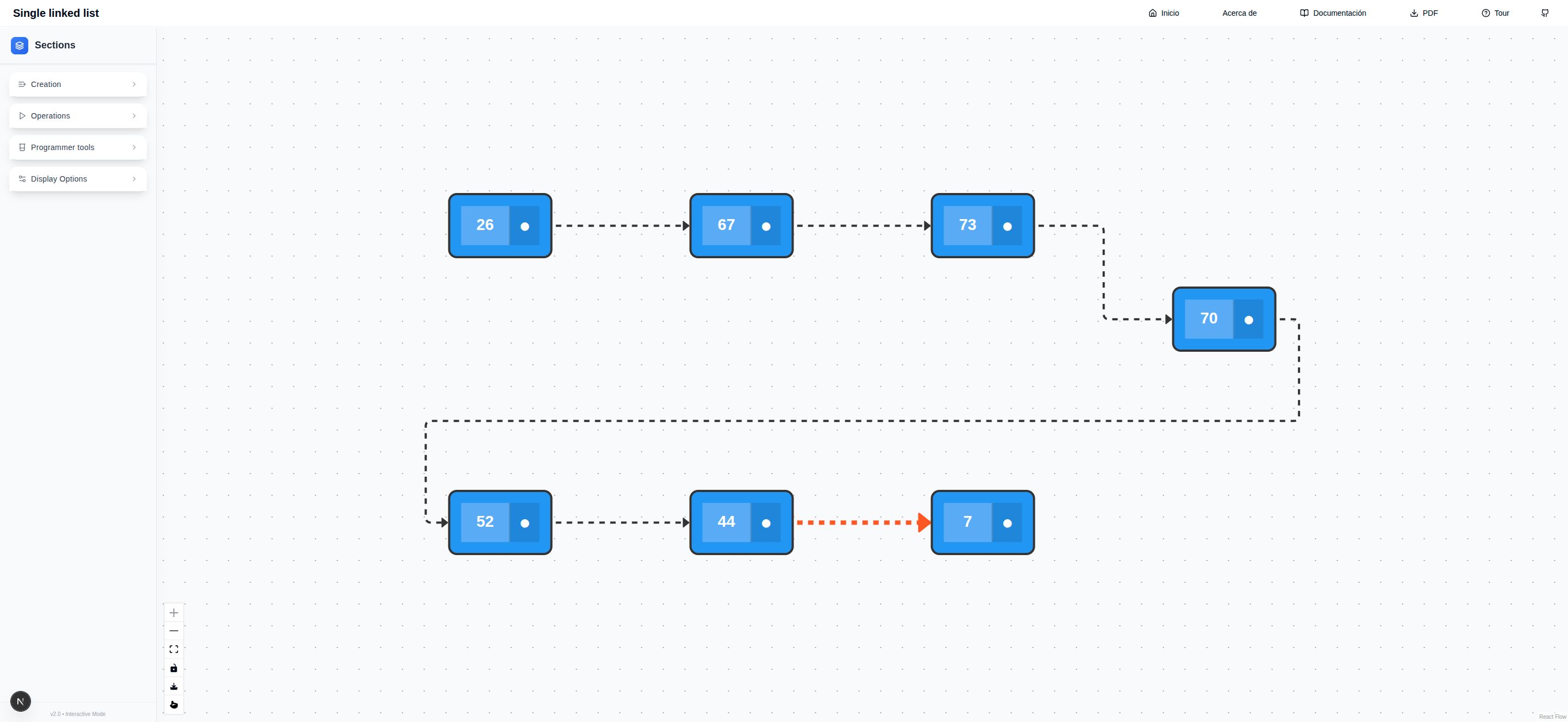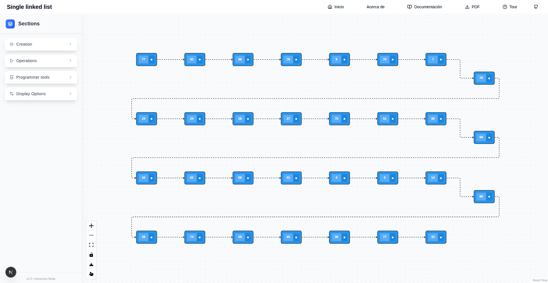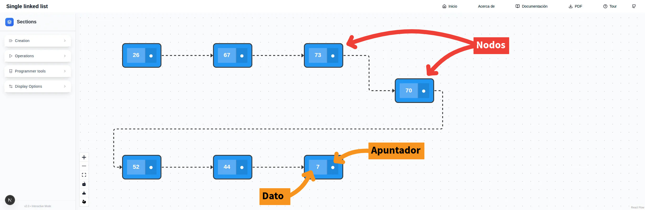 Existen diferentes formas de interactuar con la representación visual de la lista enlazada. Los nodos de la lista pueden ser reposicionados y su encadenamiento puede ser alterado. En la parte inferior izquierda del lienzo se encuentra una pequeña barra vertical con botones que tienen acción sobre la visualización del lienzo.