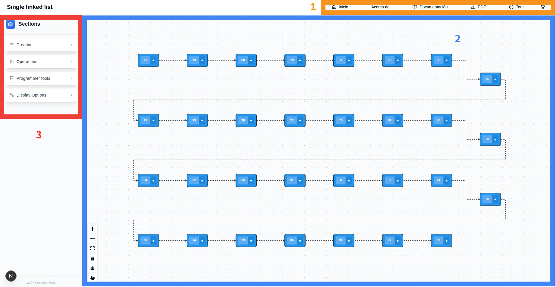 Las otras dos partes son las más importantes para la interacción con el programador. En la sección vertical izquierda se puede apreciar una barra de menús. En el caso de la figura todos ellos se encuentran colapsados y entre otros, presentan los títulos: List Creation, Operations, Programmer Tools y Display Options. Finalmente en la sección vertical derecha se encuentra el lienzo que es el lugar donde aparecen las representaciones gráficas. En este caso se aprecia una lista de números. En las secciones siguientes se muestra detalladamente cada una de las funcionalidades.